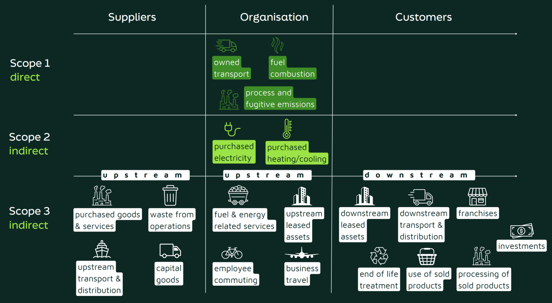 A business’s carbon footprint is comprised of three main elements, known as ‘scopes’. These scopes help categorise different types of emissions, making it easier for companies to measure and manage their environmental impact.